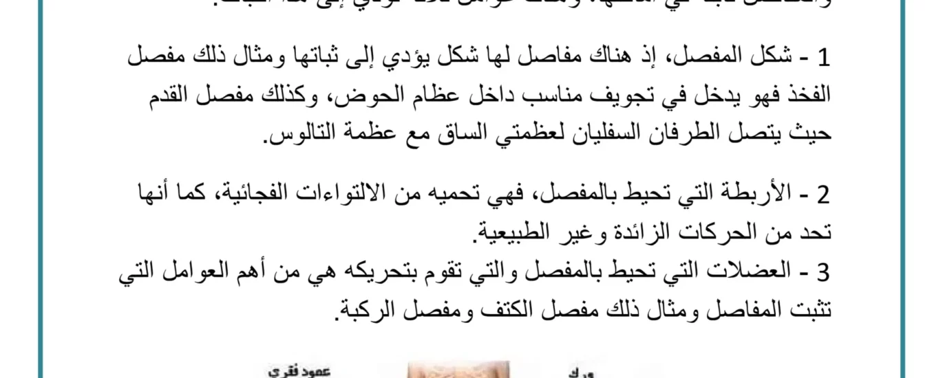 1 – شكل المفصل، إذ هناك مفاصل لها شكل يؤدي إلى ثباتها ومثال ذلك مفصل الفخذ فهو يدخل في تجويف مناسب داخل عظام الحوض، وكذلك مفصل القدم حيث يتصل الطرفان السفليان لعظمتي الساق مع عظمة التالوس.